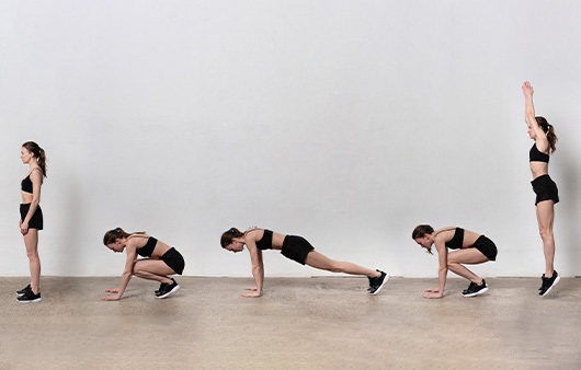 방법: 제자리에서 점프 → 팔굽혀펴기 자세로 내려갔다가 다시 점프