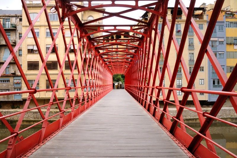 대성당에서 조금만 내려오면 ‘오냘 강(Riu Onyar)’을 가로지르는 빨간 철교 ‘산 펠리우 다리(Pont de Sant Feliu)’가 나옵니다. 이 다리 위에서 바라보는 지로나의 강변 건물은 형형색색으로 물들어 있으며, 유럽 특유의 감성을 한껏 자아냅니다. 강 위로 비치는 건물들의 반영은 마치 한 폭의 그림 같아, 사진 찍기 좋은 명소로 사랑받고 있습니다.